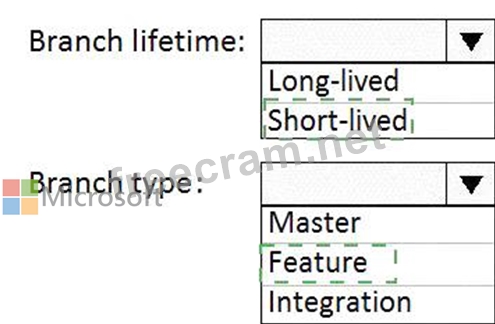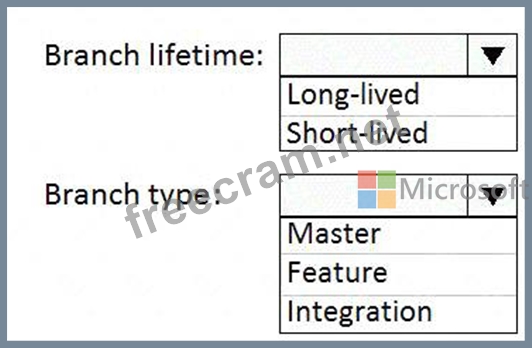 Which branch lifetime and branch time should you use in the branching model? To answer, select the appropriate options in the answer area.