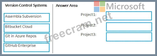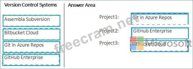 Which version control system should you recommend for each project? To answer, drag the appropriate version control systems to the correct projects. Each version controlsystem may be used once, more than once, or not at all. You may need to drag the split bar between panes or scroll to view content.