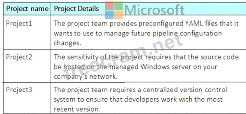 You are configuring Azure Pipelines for three projects in Azure DevOps as shown in the following table.