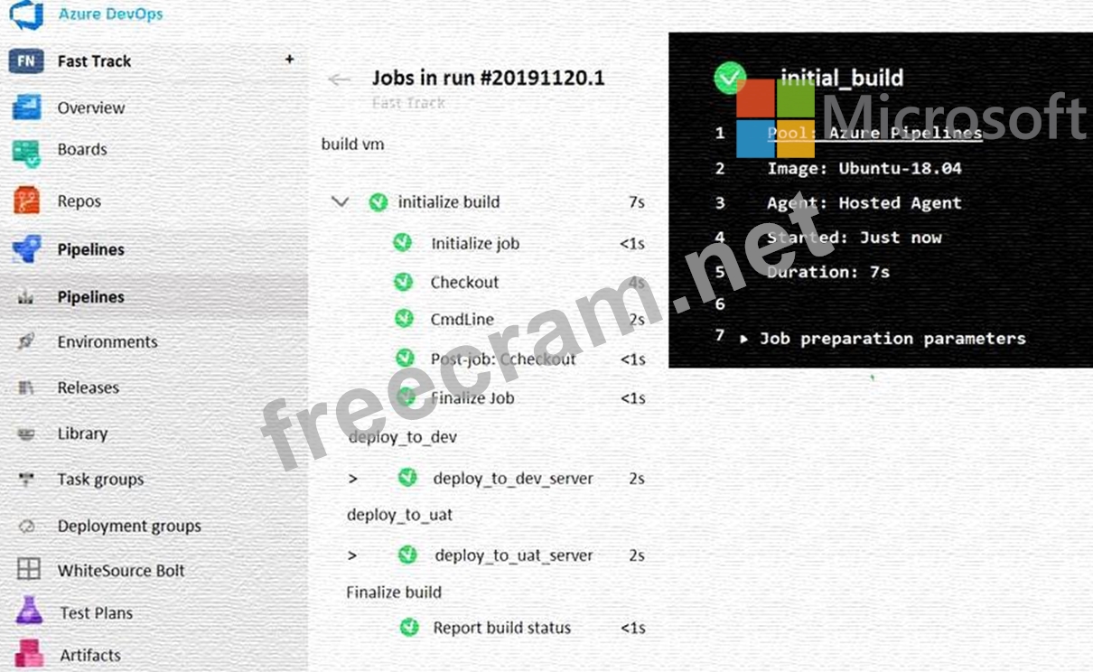 You execute a pipeline and receive the results in the web portal for Azure Pipelines as shown in thefollowing exhibit.