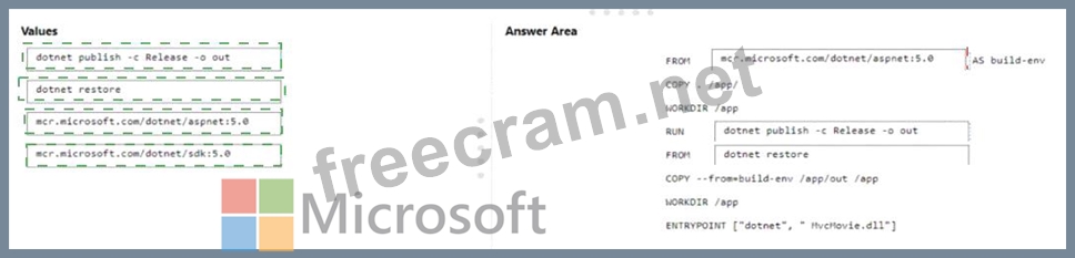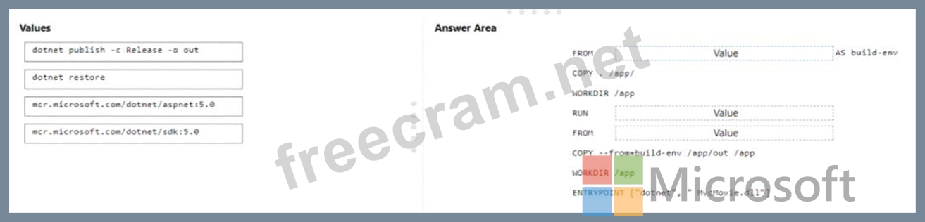 You need to create a Docker file to build the image. The solution must ensure that the size of the image is minimized How should you configure the file? To answer, drag the appropriate values to the correct targets. Each value may be used once, more than once, or not at all. You may need to drag the split bar between panes or scroll to view content.