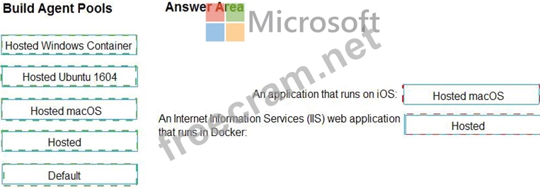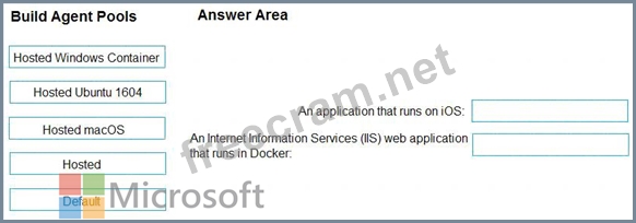 Which build agent pool should you use to compile each application type? To answer, drag the appropriate built agent pools to the correct application types. Each butt agent pool may be used once, more than once, or not at all. You may need to drag the split bar between panes or scroll to view content.