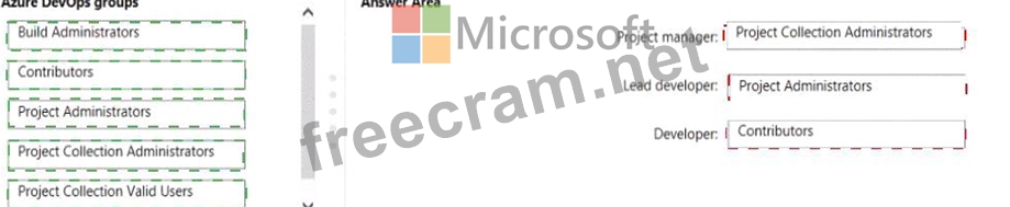 To which Azure DevOps groups should you add each team? To answer, drag the appropriate groups to the correct teams. Each group may be used once, more than once, or not at all. You may need to drag the split bar between panes or scroll to view content.