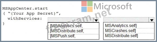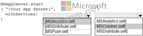 How should you complete the code to initialize App Center in the mobile application? To answer, select the appropriate options in the answer area.