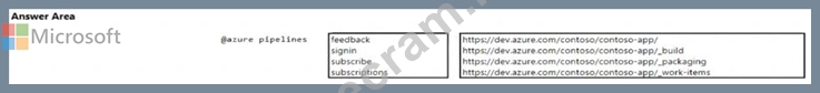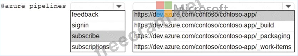 You have a project in Azure DevOps named Contoso App that contains pipelines in Azure Pipelines for GitHub repositories. You need to ensure that developers receive Microsoft Teams notifications when there are failures in a pipeline of Contoso App. What should you run in Teams? To answer, select the appropriate options in the answer area. NOTE: Each correct selection is worth one point.