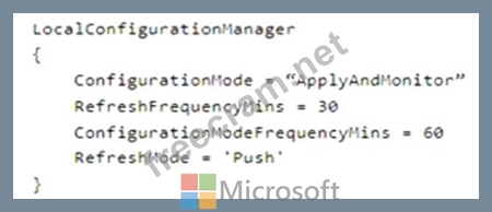 You have the following Local Configuration Manager (LCM) configuration.