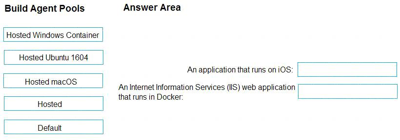 Which build agent pool should you use to compile each application type? To answer, drag the appropriate built agent pools to the correct application types. Each butt agent pool may be used once, more than once, or not at all. You may need to drag the split bar between panes or scroll to view content.