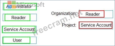 Which role memberships are required for the Azure DevOps organization and the project? To answer, drag the appropriate role memberships to the correct targets. Each role membership may be used once, more than once, or not at all. You may need to drag the split bar between panes or scroll to view content.
