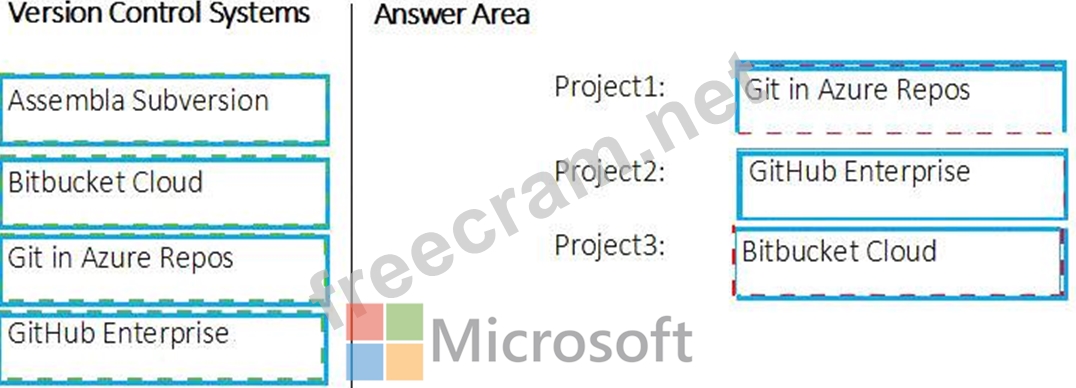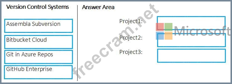 Which version control system should you recommend for each project? To answer, drag the appropriate version control systems to the correct projects. Each version control system may be used once, more than once, or not at all. You may need to drag the split bar between panes or scroll to view content.