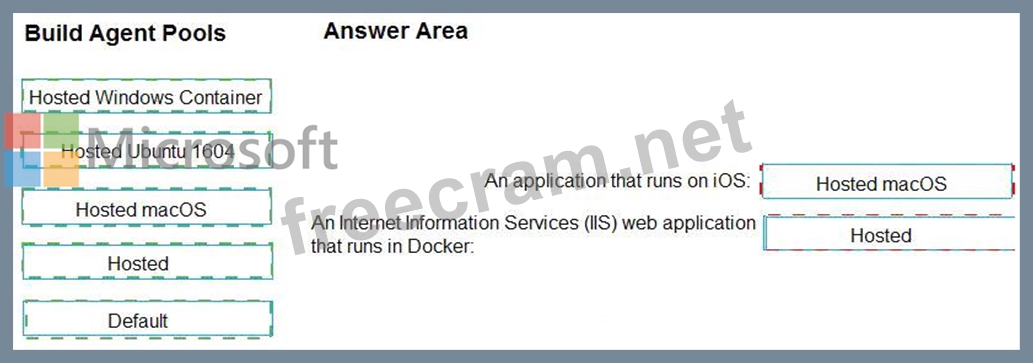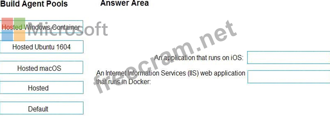 Which build agent pool should you use to compile each application type? To answer, drag the appropriate built agent pools to the correct application types. Each butt agent pool may be used once, more than once, or not at all. You may need to drag the split bar between panes or scroll to view content.