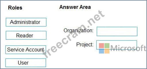 Which role memberships are required for the Azure 0e%Oos organization and the project? To answer, drag the appropriate role membership to the correct targets. Each role membership may be used once, more than once, or not at all. You may need to drag the split bar between panes or scroll to content NOTE: Each correct selection is worth one point.