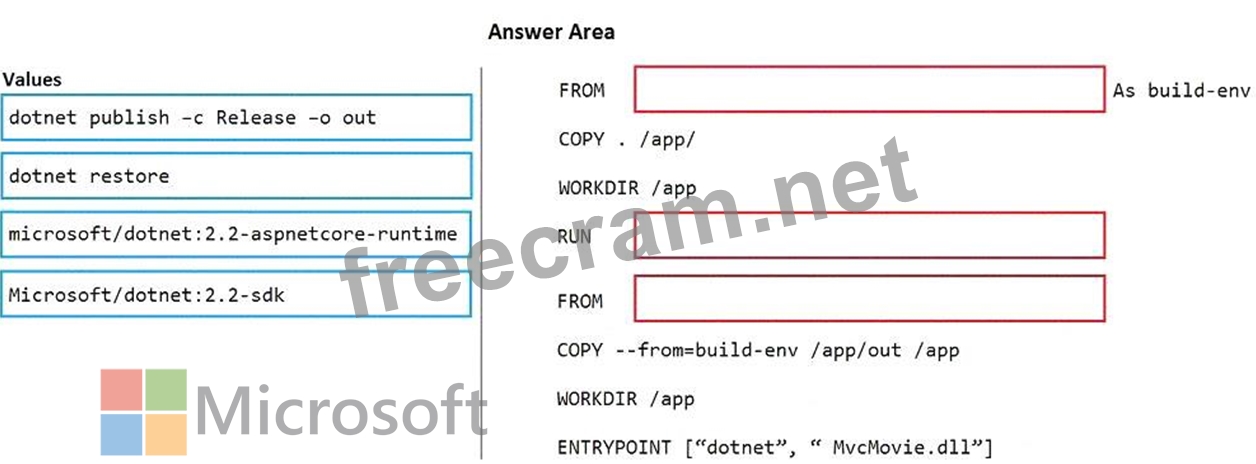microsoft.com/dotnet/core/sdk:2.1 comes packaged with the .NET core 2.1 SDK installed, so it's up to the task of building ASP .NET core projects targeting version 2.1 Box 2: dotnet restore The next instruction changes the working directory in our container to be /app, so all commands following this one execute under this context.