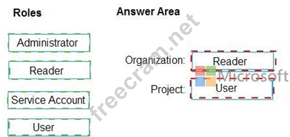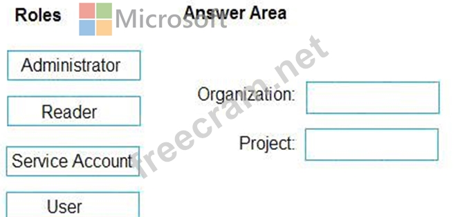 Which role memberships are required for the Azure 0e%Oos organization and the project? To answer, drag the appropriate role membership to the correct targets. Each role membership may be used once, more than once, or not at all. You may need to drag the split bar between panes or scroll to content NOTE: Each correct selection is worth one point.