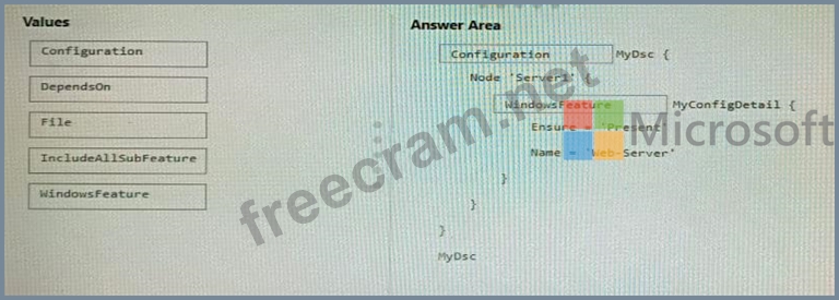 How should you complete the Desired State Configuration (DSC) configuration script? To answer, drag the appropriate values to the correct locations. Each value may be used once, more than once, or not at all. You may need to drag the split bar between panes or scroll to view content.