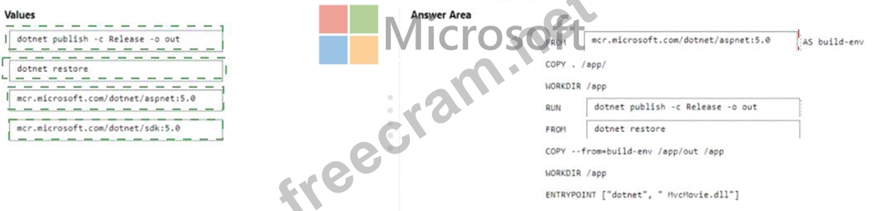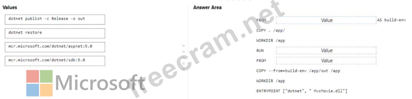 You need to create a Docker file to build the image. The solution must ensure that the size of the image is minimized How should you configure the file? To answer, drag the appropriate values to the correct targets. Each value may be used once, more than once, or not at all. You may need to drag the split bar between panes or scroll to view content.