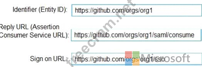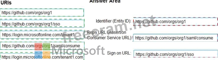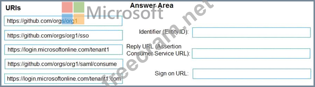 Which URIs should you use for the SAML configuration in Azure AD? To answer, drag the appropriate URIs to the correct settings. Each URI may be used once, more than once, or not at all. You may need to drag the split bar between panes or scroll to view content.
