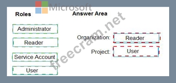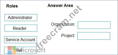 Which role memberships are required for the Azure 0e%Oos organization and the project? To answer, drag the appropriate role membership to the correct targets. Each role membership may be used once, more than once, or not at all. You may need to drag the split bar between panes or scroll to content NOTE: Each correct selection is worth one point.