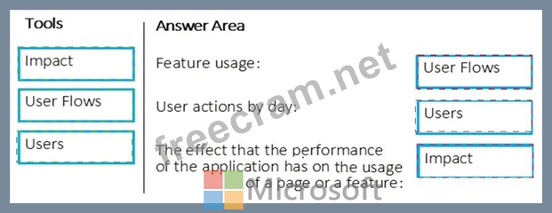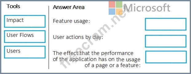 Which application Insights tool should you use to analyze each behavior? To answer, drag the appropriate tools to the correct behaviors. Each tool may be used once, more than once, or not at all. You may need to drag the split bar between panes or scroll to view content.