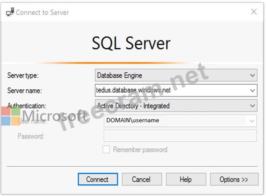 1. Start Management Studio or Data Tools and in the Connect to Server (or Connect to Database Engine) dialog box, in the Authentication box, select Active Directory - Integrated. No password is needed or can be entered because your existing credentials will be presented for the connection.