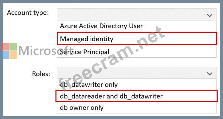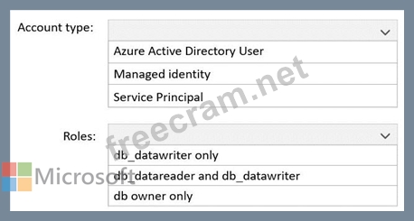 Which type of account should App1 use to access SQL1, and which database roles should you assign to App1? To answer, select the appropriate options in the answer area.