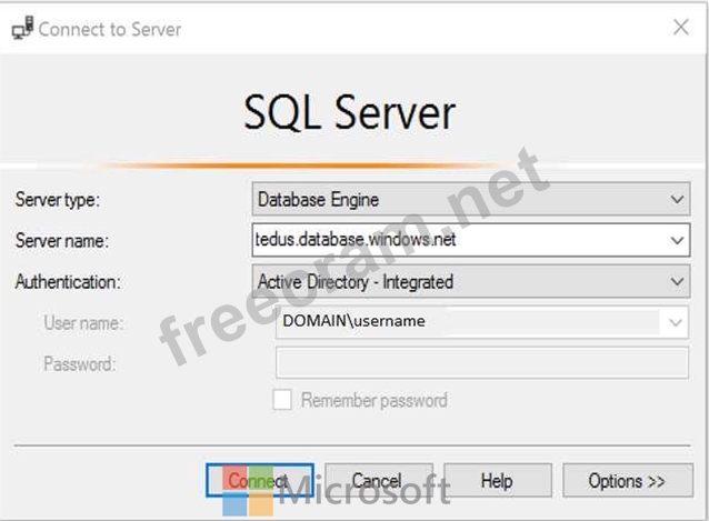 1. Start Management Studio or Data Tools and in the Connect to Server (or Connect to Database Engine) dialog box, in the Authentication box, select Active Directory - Integrated. No password is needed or can be entered because your existing credentials will be presented for the connection.