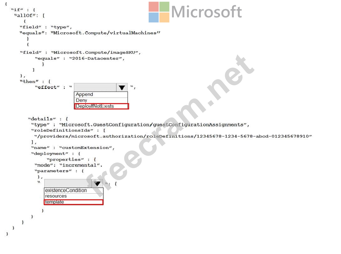 You need to implement a policy to ensure that each virtual machine has a custom antimalware virtual machine extension installed.