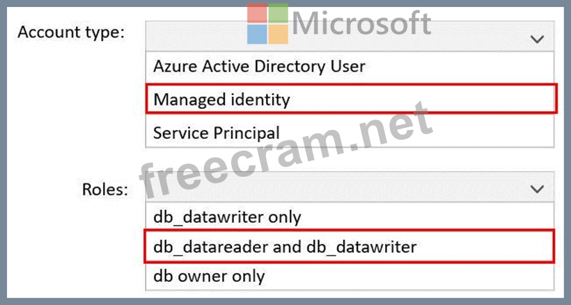 Which type of account should App1 use to access SQL1, and which database roles should you assign to App1? To answer, select the appropriate options in the answer area.