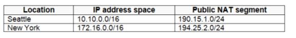 Your company has two offices in Seattle and New York. Each office connects to the Internet by using a NAT device. The offices use the IP addresses shown in the following table.
