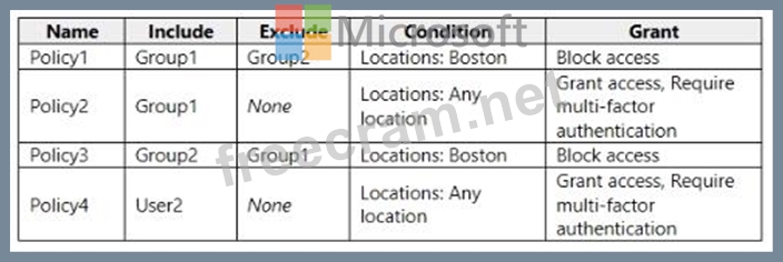 You create the conditional access policies for a cloud app named App1 as shown in the following table.