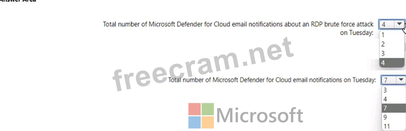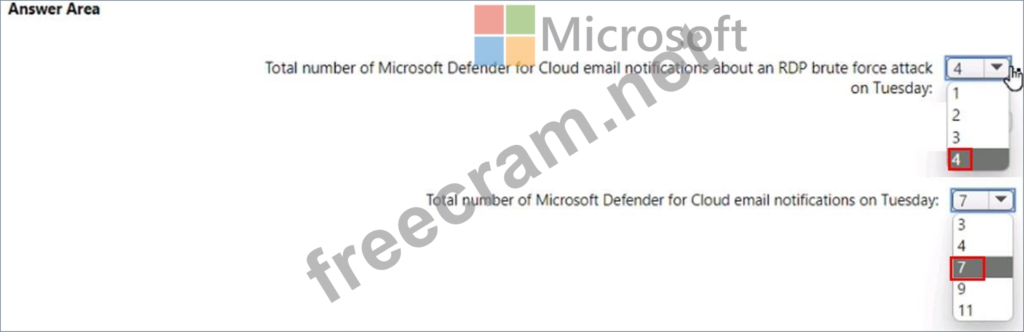 On Monday, you configure an email notification in Microsoft Defender for Cloud to notify user1 @contoso.com about alerts that have a severity level of Low, Medium, or High. On Tuesday, Microsoft Defender for Cloud generates the security alerts shown in the following table.