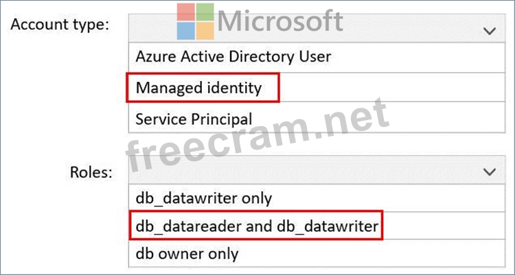 Which type of account should App1 use to access SQL1, and which database roles should you assign to App1? To answer, select the appropriate options in the answer area.