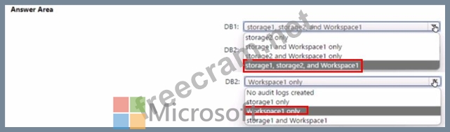 Where are the audit logs for DB1 and DB2 stored? To answer, select the appropriate options in the answer area NOTE: Each correct selection is worth one point.