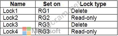 There are no locks on RG4, while the other resource groups have either Delete or Read-only locks.