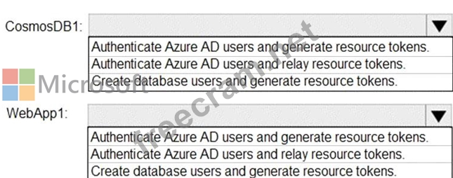 You need to identify which tasks will be implemented in CosmosDB1 and WebApp1.
