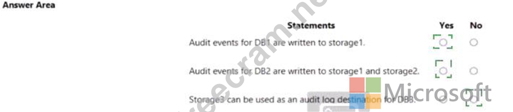 Explanation: While DB3 currently has auditing turned off, storage3 is a StorageV2 type account with Premium performance, which makes it suitable for use as an audit log destination. There's no restriction preventing it from being used for DB3's audit logs if auditing were to be enabled.