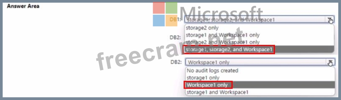 Where are the audit logs for DB1 and DB2 stored? To answer, select the appropriate options in the answer area NOTE: Each correct selection is worth one point.