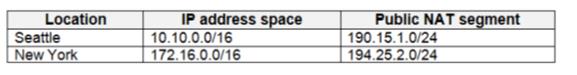 Your company has two offices in Seattle and New York. Each office connects to the Internet by using a NAT device. The offices use the IP addresses shown in the following table.