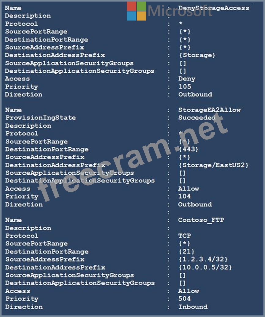 You run Get-AzureRmNetworkSecurityRuleConfig and receive the output shown in the following exhibit.