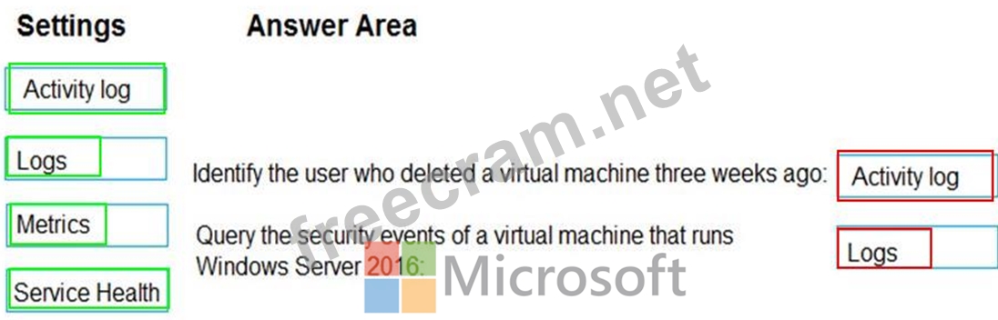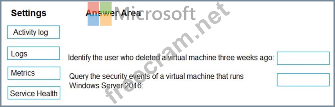 What should you use in Azure Monitor? To answer, drag the appropriate configuration settings to the correct details. Each configuration setting may be used once, more than once, or not at all. You may need to drag the split bar between panes or scroll to view content.