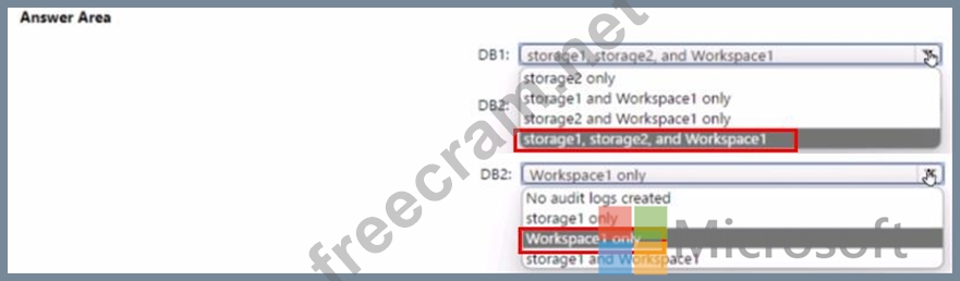 Where are the audit logs for DB1 and DB2 stored? To answer, select the appropriate options in the answer area NOTE: Each correct selection is worth one point.