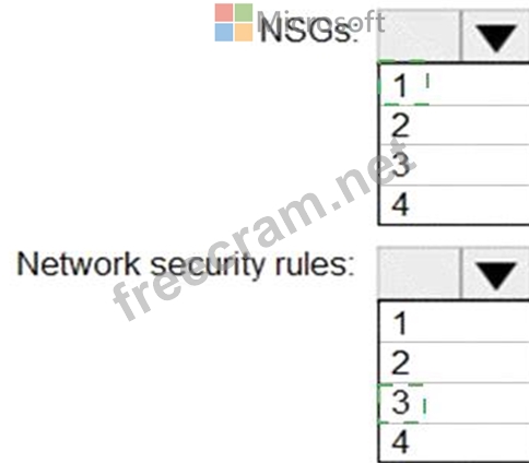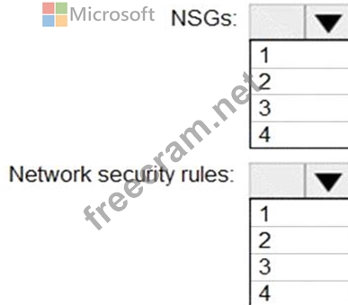 How many NSGs and network security rules should you create? To answer, select the appropriate options in the answer area.