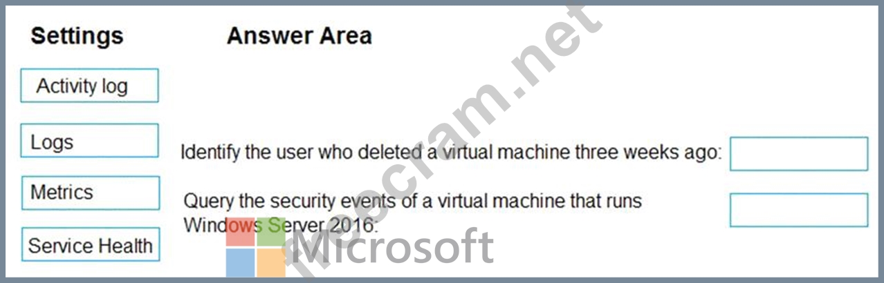 What should you use in Azure Monitor? To answer, drag the appropriate configuration settings to the correct details. Each configuration setting may be used once, more than once, or not at all. You may need to drag the split bar between panes or scroll to view content.
