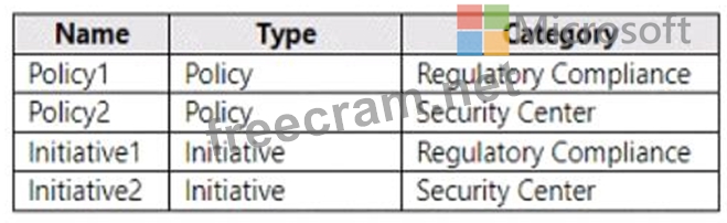 You have an Azure subscription that uses Microsoft Defender for Cloud. The subscription contains the Azure Policy definitions shown in the following table.