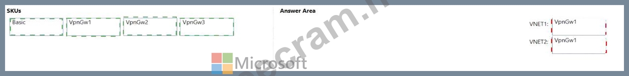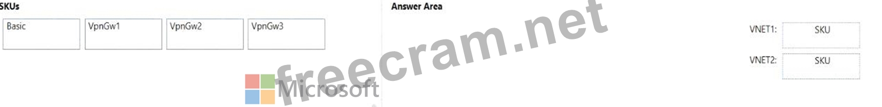 Which VPN gateway SKI) should you use for each virtual network? To answer, drag the appropriate SKUs to the correct networks. Each SKU may be used once, more than once, or not at all. You may need to drag the split bar between panes or scroll to view content.
