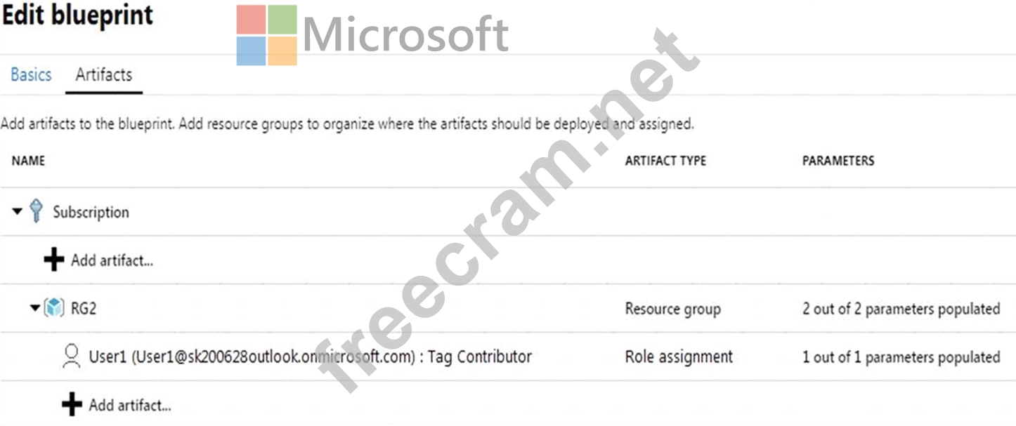 You create an Azure Blueprints definition named Blueprint1 that includes a resource group named RG2 as shown in the following exhibit.