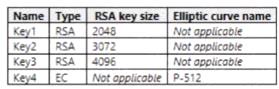 You have an Azure subscription that contains an Azure SQL database named SQL1 and an Azure key vault named KeyVault1. KeyVault1 stores the keys shown in the following table.