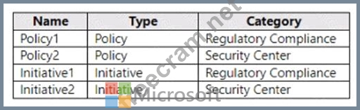 You have an Azure subscription that uses Microsoft Defender for Cloud. The subscription contains the Azure Policy definitions shown in the following table.