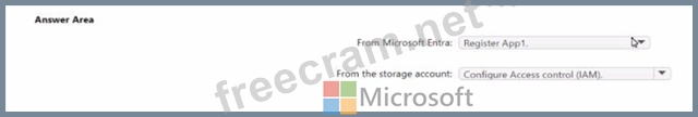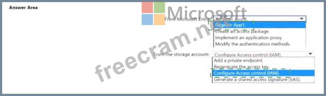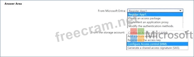 You have an Azure Storage account that contains a blob container named container! and a client application named App1. You need to enable App1 access to container1 by using Microsoft Entra authentication. What should you do? lo answer, select the appropriate options in the answer area. NOTE: Each correct selection is worth one point.