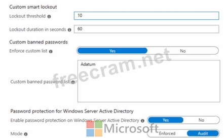 You configure the Microsoft Entra Password Protection settings for adatum.com as shown in the following exhibit.