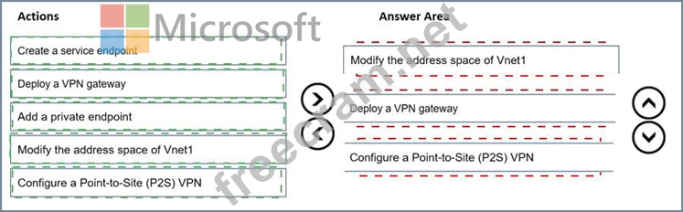 Which three actions should you perform in sequence before you can integrate WebApp1 and Vnet1? To answer, move the appropriate actions from the list of actions to the answer area and arrange them in the correct order.